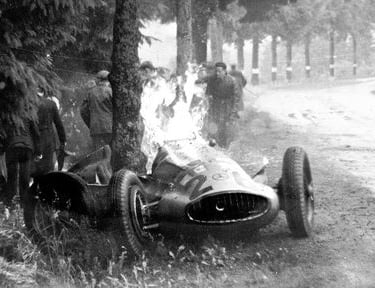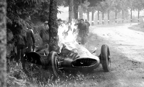 On that wet June afternoon, Seaman was 31 seconds clear of the field when, on lap 22 approaching La Source, he took a dry-weather line through a corner that was treacherous in the rain. His Mercedes W154 snapped sideways into a tree at approximately 200 km/h. The impact ruptured the fuel tank, engulfing the car in flames with Seaman unconscious inside. By the time marshals pulled him free, he had suffered severe burns across his entire body.