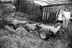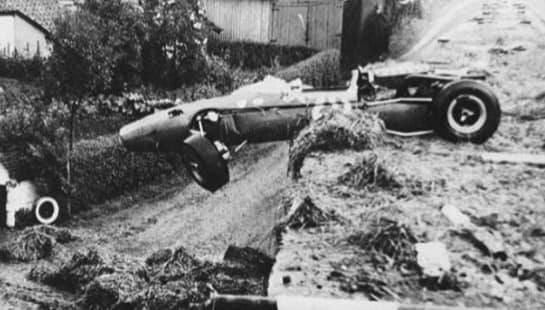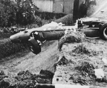 And then came the accident that would change the course of motorsport safety forever. On the same 1966 Belgian Grand Prix, in heavy rain, Jackie Stewart's BRM left the road at the Masta section — the fastest and most exposed part of the circuit — and came to rest in a farmyard ditch, wedged under a fence. Stewart was trapped inside the cockpit with the fuel tank ruptured and petrol flooding around him.
