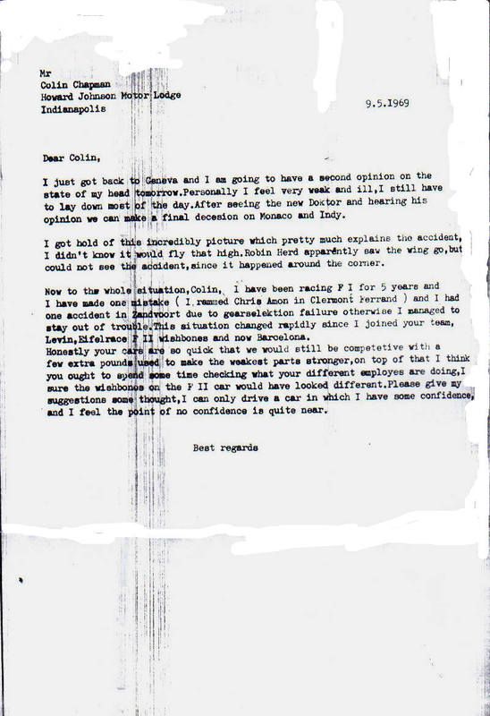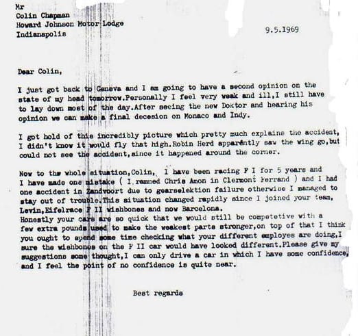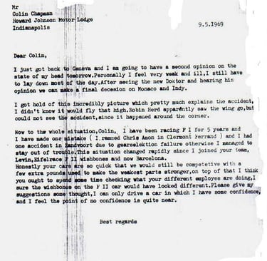 The incident ignited a fierce debate about safety. Rindt publicly criticized Lotus team owner Colin Chapman and the use of such delicate aerodynamic devices. In a letter he sent to Chapman on 9 May 1969, Rindt expressed his deep concerns: he argued that the cars were so quick they could still compete even if built sturdier, and insisted he could only drive a car in which he had confidence. This letter revealed not just frustration, but an acute awareness that the pursuit of speed at Lotus often came at the expense of reliability and safety.