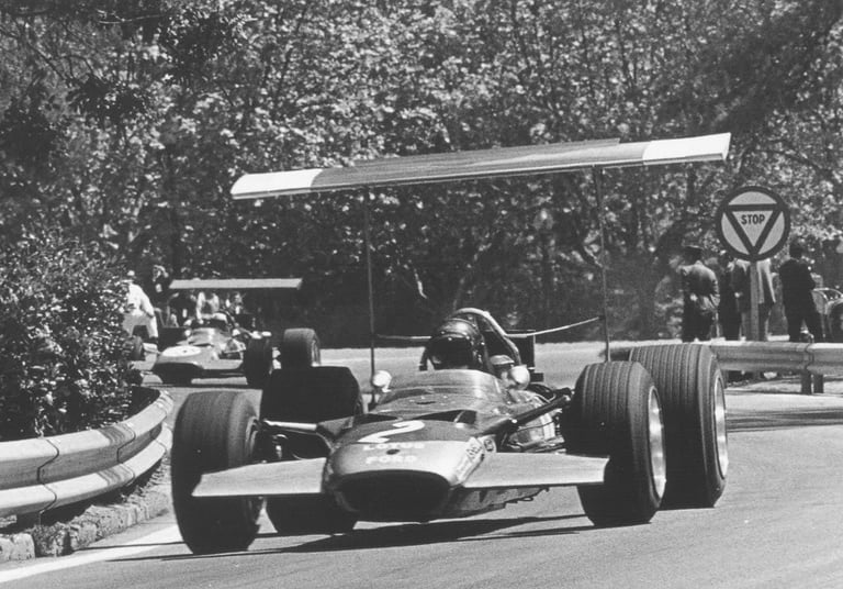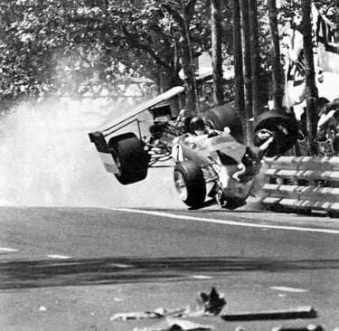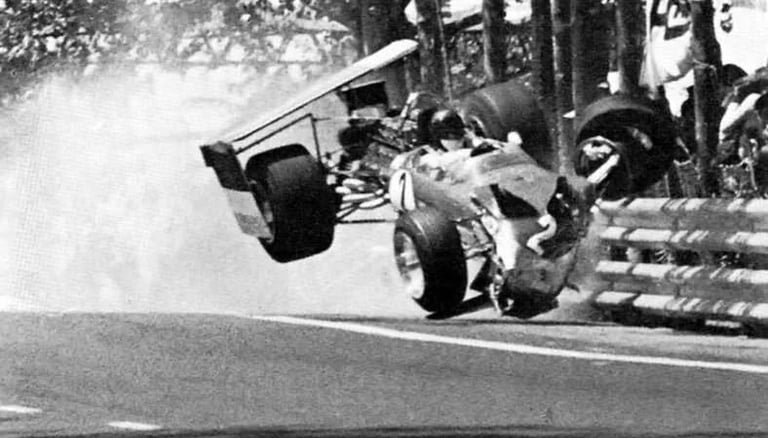 That fragility was laid bare early in his Lotus career at the 1969 Spanish Grand Prix at Montjuïc Park. During that race, Lotus cars equipped with suspension-mounted wings experienced catastrophic failures: first Graham Hill’s car lost its rear wing and crashed, then Rindt’s Lotus suffered the same fate at high speed. The aerodynamic failure lifted the car off the track and into barriers, where it struck Hill’s wrecked machine. Rindt survived with relatively minor injuries — a broken nose — but the danger was unmistakable.