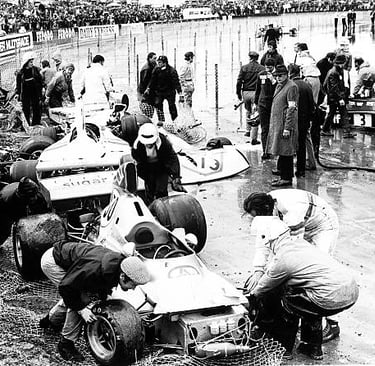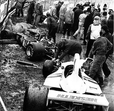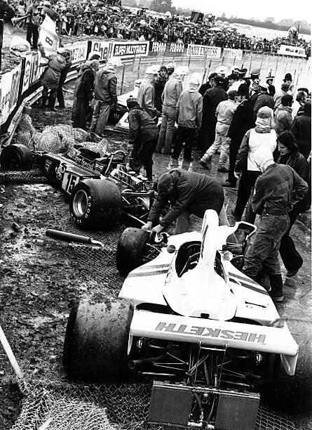 Then, on lap 19, the rain began to fall on the far side of the Silverstone airfield — at Stowe Corner and Club Corner. Within a lap, Regazzoni lost control, clouting his rear wing on a barrier at Club. He limped into the pits. Pryce, who had taken the lead, crashed out at Becketts on lap 21. Just like that, the race's two most natural frontrunners were gone.